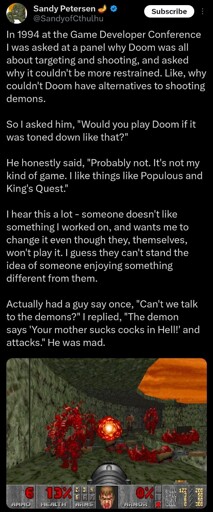 arrow-up1823arrow-down1imageCommentary on taking feedback as a game designer, from someone who worked on the original DOOM. media.piefed.worldThe Picard Maneuver@piefed.worldEnglish · 9 days agomessage-square115linkfedilink