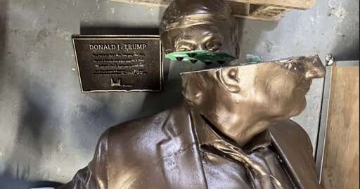 One photo shows that President Donald Trump’s head was sliced clear in half during the takedown. A second shows that Trump and convicted sex offender Jeffrey Epstein’s arms, still clasped together in the bonds of friendship, were snapped off their respective bodies during the toppling.
