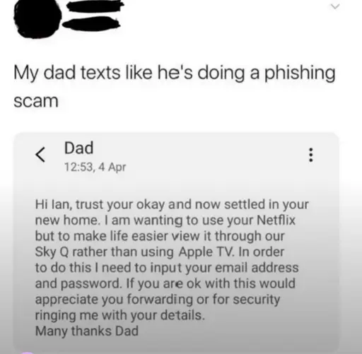 Some scammers are getting into sophisticated targeting, it’s not outside the realm of possibility they’ve sim-swapped Dad’s phone and intentionally worded it like that knowing you’d call that number and they’d be able to intercept it. Hell these days if they are able to get just seconds of your dad’s voice they’d even be able to have a convincing AI voice on the other end