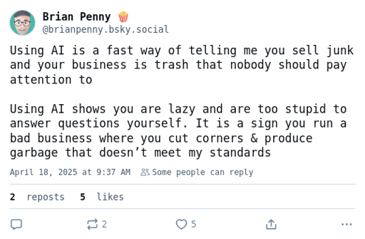 I have to disagree with that one but not completely. It really depends on what type of company I interact with . is that an independent small company or a big corp . also what type of AI (generate picture or generate summary etc…) And is the application fullfit or not . ex if you generate a logo or a picture in a small business is the style of the picture correct or is it the same as everyone , also did you check if the image was correct etc…