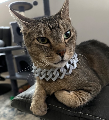 I really hope he isn’t wearing that all day. Cats are sensitive creatures and even plastic chains can snag their fur and overstimulate them.