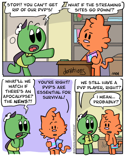 Jen is loading DVD’s into a donation box. Admiral: Stop!! You can’t get rid of our DVD’s! What if the streaming sites go down?! - Admiral: What’ll we watch if there’s an apocalypse? The NEWS?! Jen: You’re right! DVD’s are essential for survival! - Admiral: We still have a DVD player, right? Jen: I mean… probably