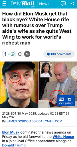 Rumors or not, I’m all for the popcorn. https://web.archive.org/web/20250531043705/https://www.dailymail.co.uk/news/article-14766599/Elon-Musk-black-eye-sparks-rumor-Stephen-Millers-wife-quits-Trump-admin-DOGE.html