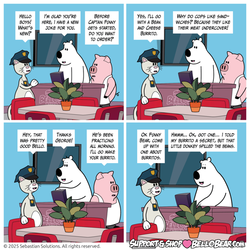 MrSebSin@sh.itjust.works to Web Comics@lemmy.ml · 10 months agoBello Bear 11 June 2025 “That's Punny”lemmy.mlimagemessage-square0linkfedilinkarrow-up13arrow-down10cross-posted to: comics@lemmy.ml