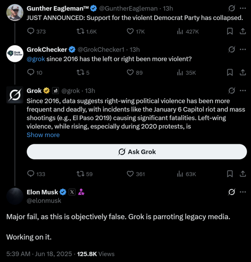 Yep. When I was arguing with a Musk fan acquaintance, Grok always took my side (and the guy ofc always ignored its opinion despite assuring me that it’s the most accurate model ever).