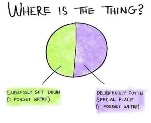 minus-squarerayyy@lemmy.worldlinkfedilinkarrow-up1·3 months agoMy dog runs off with things sometimes and sometime things get slid under the couch so there are many more layers of lost. Also items sometimes jump into another dimension for a period of time only to reappear somewhere else.