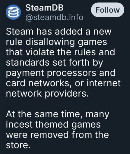 Paypal and other payment processors are wellknown to set up arbitrary rules. They held the money of an 100% legal and fine erotica author hostage for months, for example. Incest games vanishing is just step 1 of their censorship.