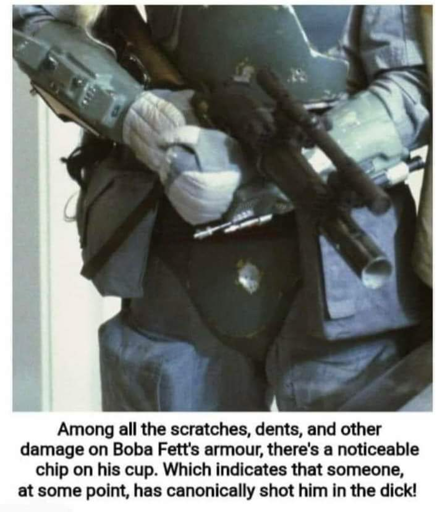 On top of that, is the largest single scar on his Vescar armor, even looking like an actual crater. Someone didn’t just shoot him on the dick, they scored a cock shot with a canon and he walked away.