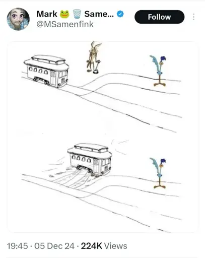 minus-squarekaty ✨@piefed.blahaj.zonelinkfedilinkEnglisharrow-up32·19 days agothe switch wouldn’t work so roadrunner would eat all the birdseed and leave and the coyote would walk onto the tracks, scratch his head, then the level would slide into place and the trolley would run him over.