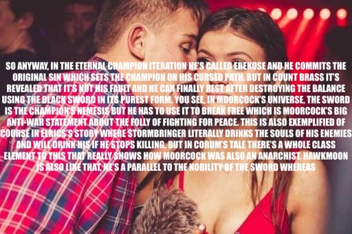 SO ANYWAY, IN THE ETERNAL CHAMPION ITERATION HE’S CALLED EREKOSE AND HE COMMITS THE ORIGINAL SIN WHICH SETS THE CHAMPION ON HIS CURSED PATH. BUT IN COUNT BRASS IT’S REVEALED THAT IT’S NOT HIS FAULT AND HE CAN FINALLY REST AFTER DESTROYING THE BALANCE USING THE BLACK SWORD IN IT’S PUREST FORM. YOU SEE, IN MOORCOCK’S UNIVERSE, THE SWORD IS THE CHAMPION’S NEMESIS BUT HE HAS TO USE IT TO BREAK FREE WHICH IS MOORCOCK’S BIG ANTI-WAR STATEMENT ABOUT THE FOLLY OF FIGHTING FOR PEACE. THIS IS ALSO EXEMPLIFIED OF COURSE IN ELRICS’S STORY WHERE STORMBRINGER LITERALLY DRINKS THE SOULS OF HIS ENEMIES AND WILL DRINK HIS IF HE STOPS KILLING. BUT IN CORUM’S TALE THERE’S A WHOLE CLASS-ELEMENT TO THIS THAT REALLY SHOWS HOW MOORCOCK WAS ALSO AN ANARCHIST. HAWKMOON IS ALSO LIKE THAT, HE’S A PARALLEL TO THE NOBILITY OF THE SWORD WHEREAS