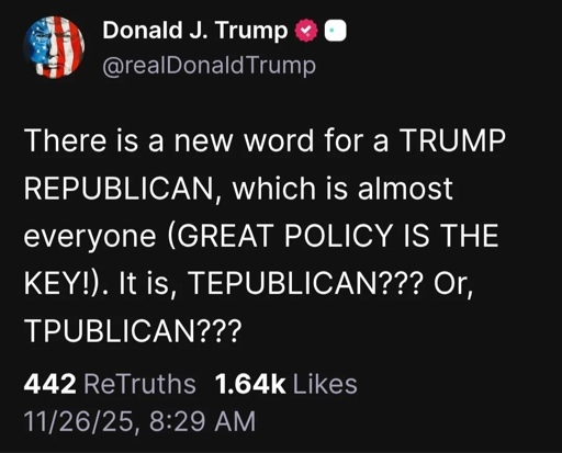 I think he’s suggesting those words as the replacement which is just as bad because they are the worst suggestions. “Trumpublican” is right there and strokes his ego.
