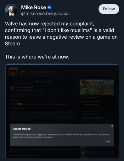 ByteOnBikes@discuss.online to Bluesky@lemmy.world · 4 months ago"I don't like Muslims" is a valid steam review according to Valvediscuss.onlineimagemessage-square146linkfedilinkarrow-up1567arrow-down134file-text