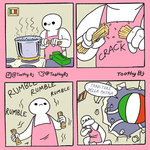 Got converted to the church of snapping spaghetti by persians doing it and telling me that they give a donkey’s cock about what Italians think