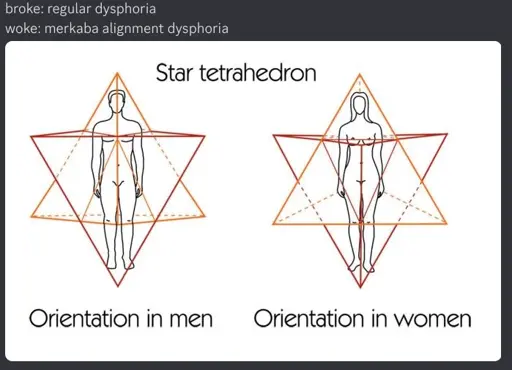 Is it because the red pyramid is pointy in the women’s breasts and the yellow one is pointy in the men’s crotch? How are you aligned if you have both? Does getting my merkaba unaligned give me more energy because of the reduction in entropy?