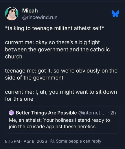 tbf, teenage me would be pretty puzzled by a sassy pope from Chicago that keeps getting involved in American politics. also by how much middle-aged me agrees with that pope.