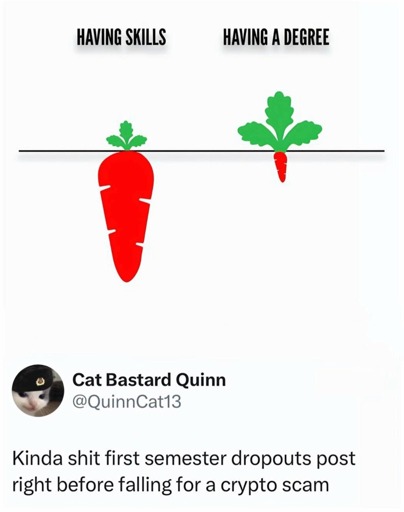 It’s pretty funny reading the comments because honestly I would generally agree with the meme. But I’m coming at this from the perspective of a systems administrator and when it comes to dealing with networking and security most of the people I see coming out of college with degrees don’t know a goddamn thing. Their courses are like 10 years out of date and not even remotely relevant to the real world but because they spent so much money on getting it they are very inflexible about changing how they were taught.