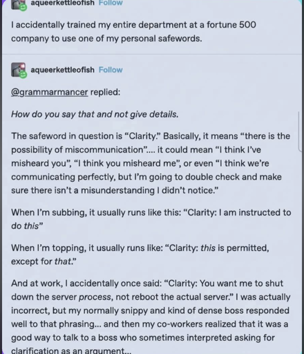 I’ve heard people use “for clarity,” to clarify an ask… and, though my experience is limited, I’ve never heard it used in kink (before)