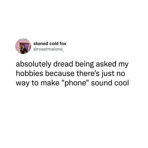 “Phone” ok so you don’t know how to explain your online obsession with normies. Here’s a clue, lie. Do you like a sport but don’t really follow it? That’s your hobby. Did you cook food last week? Hobby. Did you drink alcohol in the last week? Do you know the names of the expensive brands of whatever you drank? Hobby.