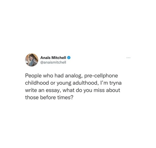 Calling friends on the phone and having an actual conversation being a normal thing. And heck, you might get to know their family a little too because you never knew who was going to pick up the phone.